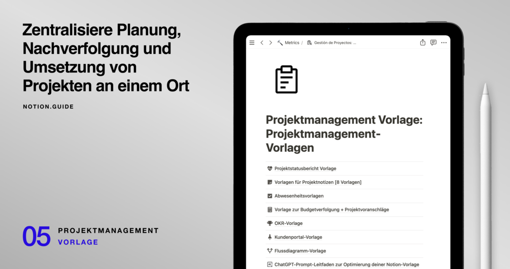 Ein komplettes Set an Notion-Vorlagen, entwickelt zur Verwaltung aller Phasen eines Projekts – von der Planung, dem Monitoring und der Leistungsbewertung bis hin zum Finanzmanagement und der Kundenkommunikation.